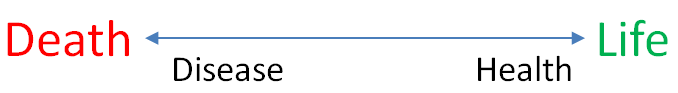 Health and disease are better viewed in their relationship to life and death. They are at opposite ends of the same continuum. When a person loses all of their life, they are dead. Conversely, when a person expresses 100% life, they are as far away from physical death as possible (barring catastrophic accidents).